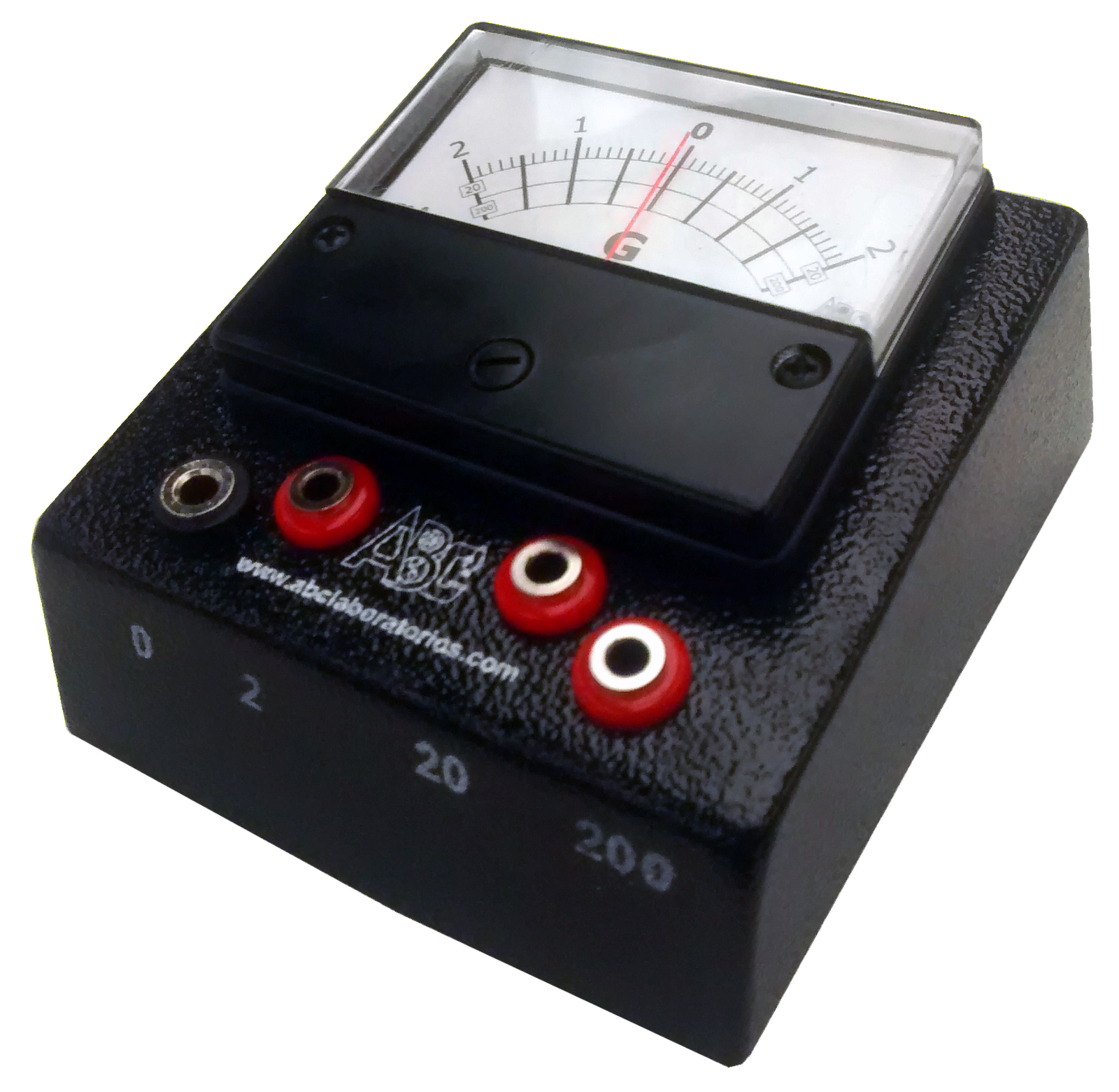 Galvanómetro análogo. Útil para para comprobar la dirección de una corriente eléctrica. Con escala de medición centro cero. Sensibilidad 0.1 miliamperio, hasta 200 miliamperios máximo